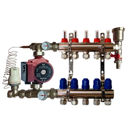 В комплект входить: Колектор з витратомірами на 5-ть виходів; 10-ть евроконусов ; Насосна група ; Кінцевий елемент колектора; циркуляційний насос . Надійність і якість.